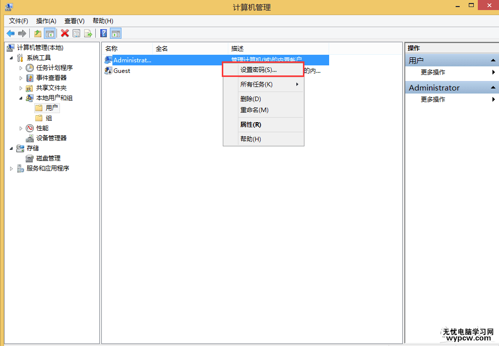 3、右鍵點擊“Administrator”選擇“設(shè)置密碼”。