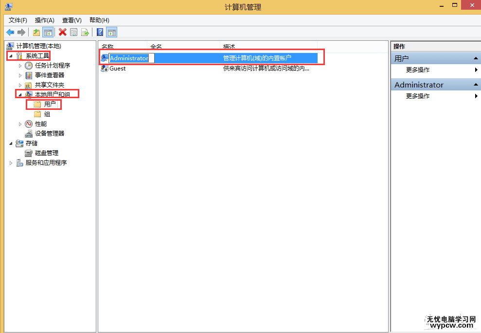 2、在管理界面中—點擊“系統(tǒng)工具—本地用戶和組—用戶”在右側(cè)找到“Administrator”。