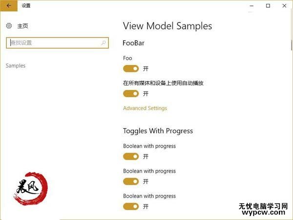 需要說明的是,Samples顧名思義,只是Win10設置項UI的樣板,盡管里面各種設置控件幾乎都已經出現,就算你在里面調節的面目全非,也絲毫不會影響當前系統設置,而且你會感覺里面的調節項目有些莫名其妙,比如你可能沒安裝什么foobar,但卻出現了……所以這個設置項應該是給相關開發人員作參考的。