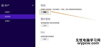 5、選擇“登錄選項”——在帳戶密碼處點擊“添加”;