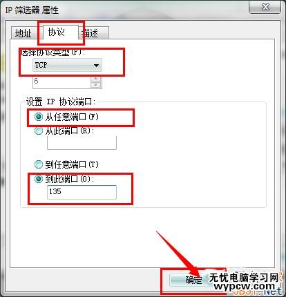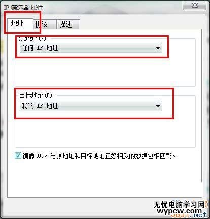 6、在出現的“IP篩選器 屬性”對話框中,選擇“地址”選項卡,“源地址”選擇“任何”,“目標地址”選擇“我的IP地址”; 選擇“協議”選項卡,各項設置如圖片中所示。設置好后點擊“確定”。