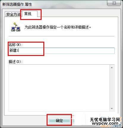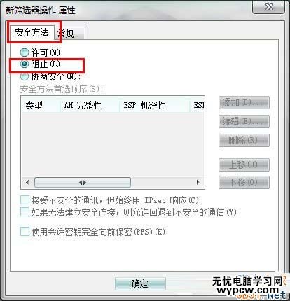 9、在“篩選器操作 屬性”中,選擇“安全方法”選項卡,選擇“阻止”選項;在“常規”選項卡中,對該操作命名,點確定