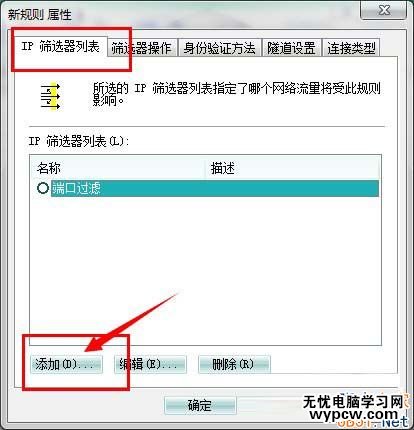 4、在彈出的“新規則 屬性”對話框中,選擇“IP篩選器列表”選項卡,單擊左下角的“添加”