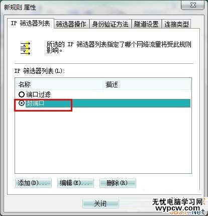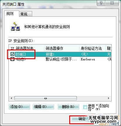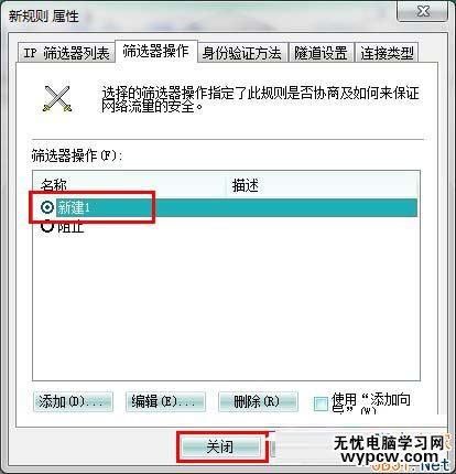 10、選中剛才新建的“新建1”,單擊關閉,返回到“關閉端口 屬性“對話框,確認“IP安全規則”中 封端口 規則被選中后,單擊 確定