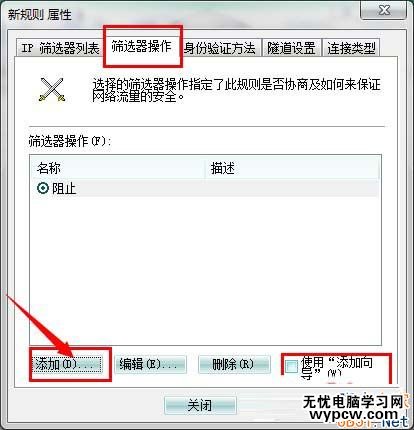 8、在ip篩選器列表中選擇剛才添加的“封端口”,然后選擇“篩選器操作”選項卡,,去掉“使用 添加向導”前面的勾,單擊“添加”按鈕