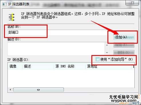 5、出現添加對話框,名稱出填“封端口”(可隨意填寫),去掉“使用 添加向導”前邊的勾后,單擊右邊的“添加”按鈕