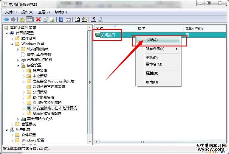 11、在組策略編輯器中,可以看到剛才新建的“關閉端口”規則,選中它并單擊鼠標右鍵,選擇“分配”選項,使該規則開始應用!