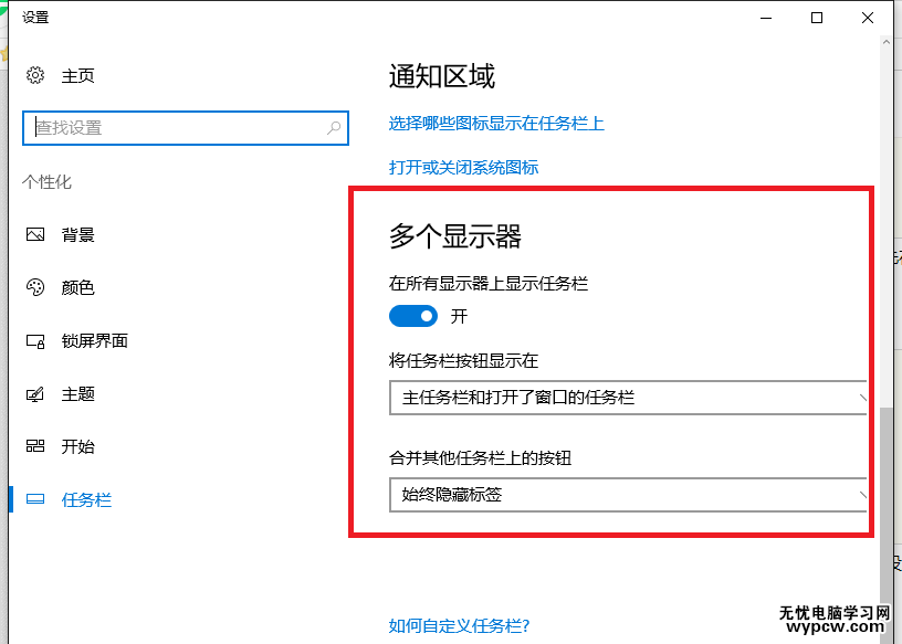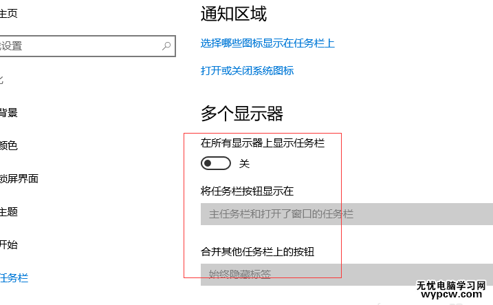 3、鼠標(biāo)往下拉動(dòng)滾動(dòng)框,到達(dá)多個(gè)顯示器項(xiàng)目,“在所有顯示器上顯示任務(wù)欄”處點(diǎn)擊關(guān),使得在非顯示屏不顯示任務(wù)欄