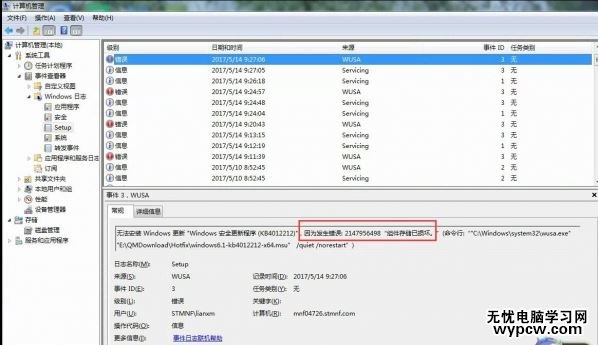 3、依次打開:計算機管理-->事件查看器-->setup-->看錯誤信息提示(來源是WUSA)-->要是錯誤提示信息中有如下提示的:無法安裝 Windows 更新"Windows 安全更新程序 (KB4012213)",因為發生錯誤:2147956498“組件存儲已損壞”(如下圖),則繼續步驟4