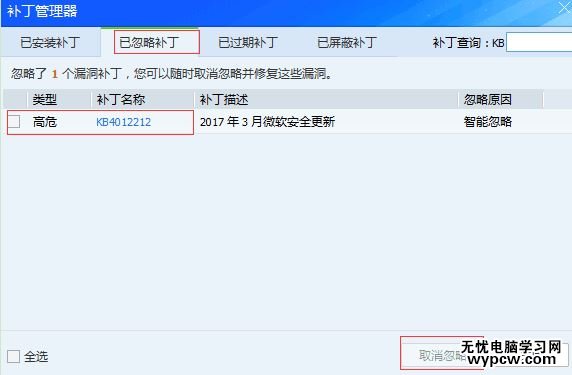在修復漏洞頁面點-->已忽略,進入補丁管理器頁面,在補丁管理器頁面點-->已忽略補丁-->選中KB4012213,點擊取消忽略按鈕