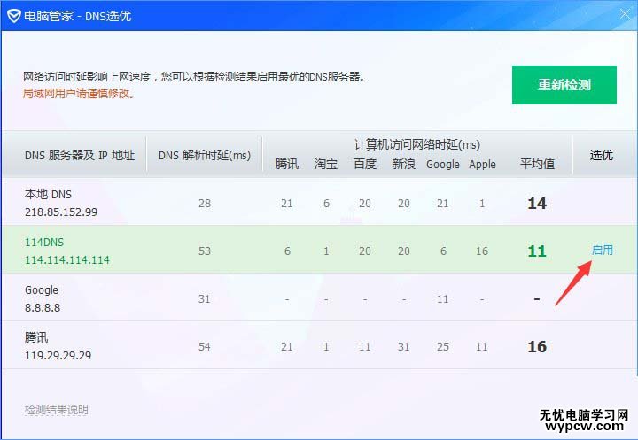 4、檢測完畢后看哪個平均值低,鼠標移動到該DNS上,點擊【啟用】即可。