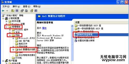 3依次展開“計算機配置→管理模板→網絡→QoS數據包調度程序”,雙擊右邊的“限制可保留帶寬”項。