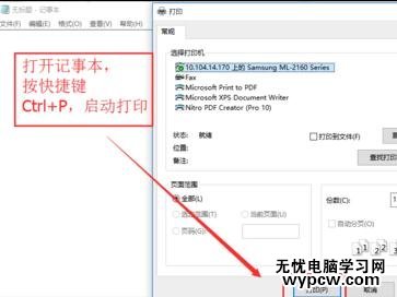 秉承不浪費紙張的原則,我們任意打開一個空白的記事本,并點擊菜單欄的“文件”,選擇“打印”,在彈出的對話框中,選中我們剛才添加的打印機。打印機默認列表中,帶有“Document、PDF”字樣的均為虛擬打印機,并不是真實的打印機,大家記住了。
