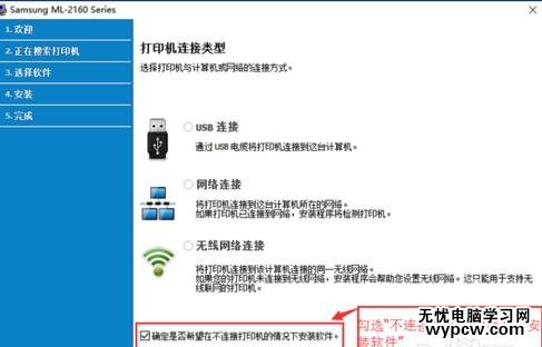 取出買打印機時候贈送的光盤,或者搜索打印機型號下載。根據提示安裝。這里有些需要說明的地方。這里推薦使用“確定希望在不連接打印機的情況下安裝軟件”,不要選擇其他選項。