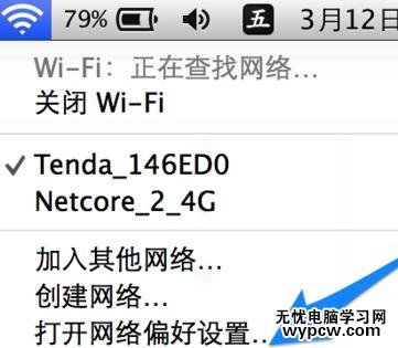 還有一種情況是,之前可以連接成功的無線網(wǎng)絡(luò),但突然有一天發(fā)現(xiàn)不能連接成功。如果是這種情況的話,上面的方法也試過了,我們還可以嘗試刪除無線的配置文件,然后再重新連接無線。還是點擊無線網(wǎng)絡(luò)圖標(biāo),再點擊底部的“打開網(wǎng)絡(luò)偏好設(shè)置”選項,如圖所示