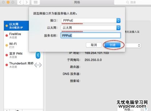 接口選擇好了以后,我們繼續(xù)設(shè)置之后的東西。以太網(wǎng)點(diǎn)開有兩個(gè)設(shè)置,WiFi和以太網(wǎng),這里我們選擇以太網(wǎng)。然后下邊的服務(wù)名稱可以隨便填寫。當(dāng)然也可以不填寫。確定你設(shè)置好了以后,點(diǎn)擊右下方的“創(chuàng)建”按鈕就可以了。