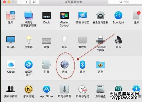 點(diǎn)擊開我們的系統(tǒng)偏好設(shè)置之后,如果你操作對(duì)了,這個(gè)時(shí)候我們就能看到如下圖所示的一個(gè)頁面。這里我不說我想你也知道該找哪一個(gè)了。對(duì)的,然后找到第三排的第四個(gè)“網(wǎng)絡(luò)”按鈕,就是它,點(diǎn)擊開網(wǎng)絡(luò)按鈕。