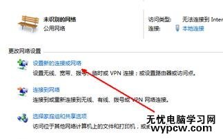 打開網(wǎng)絡(luò)和共享中心之后,這里有詳細(xì)的關(guān)于網(wǎng)絡(luò)連接方面的信息。點擊中部的設(shè)置新的連接這樣一個藍(lán)色的鏈接。