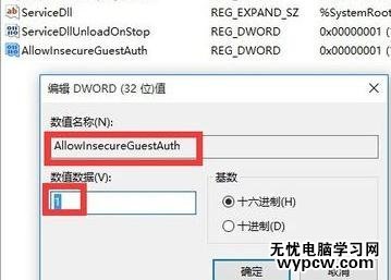 然后將新創建的DWORD項重命名為“AllowInsecureGuestAuth”,同時將其值修改為“1”,點擊“確定”完成設置操作。