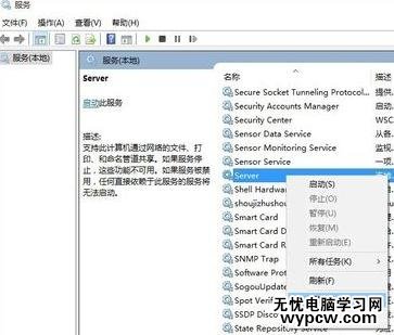 從打開的“服務”窗口中,找到“Server”服務,右擊選擇“屬性”項。