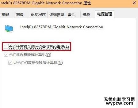 點擊“電源管理”選項卡,取消勾選“允許計算機關閉此設備以節約電源”后點擊確定,如下圖——