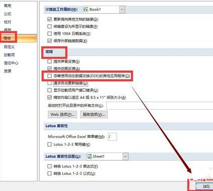 在高級選項右側列表中下拉,找到常規,把“忽略使用動態數據交換(DDE)的其它應用程序”前面的勾去掉,然后點擊“確定”按鈕,重新啟動excel程序即可!如下圖所示