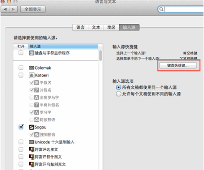 2、選擇輸入源選項卡,點擊右側的鍵盤快捷鍵設置;