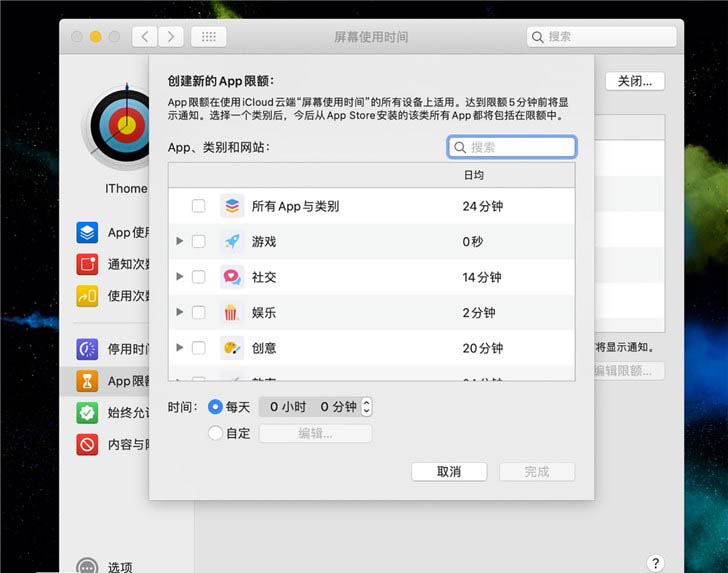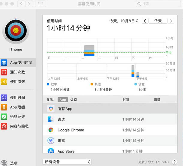 在iPhone上很受喜愛的屏幕使用時間功能現在也被引入到了macOS Catalina上。和在iPhone上一樣,在屏幕使用時間功能中,你可以獲取有關App使用情況的詳細報告,或者為熊孩子設定使用限額,在設定使用時間的限額時,你可以將某一類應用,例如游戲或視頻類,合并為同一組來統一設定使用限額。這個功能主要是針對熊孩子的,像小編這樣的上班族,通常并不會特別用到。