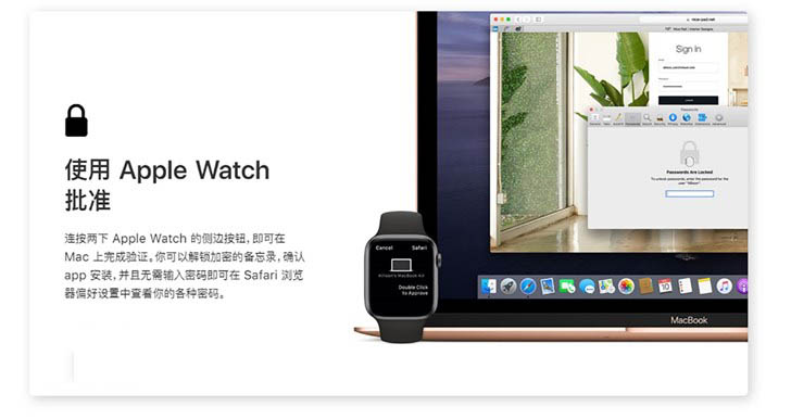 如果你有Apple Watch,你也可以在解鎖加密的備忘錄,確認App安裝等時候,連按兩下Apple Watch的側邊按鈕進行批準驗證,這個功能也適用于在Safari瀏覽器的偏好設置中查看密碼的驗證。