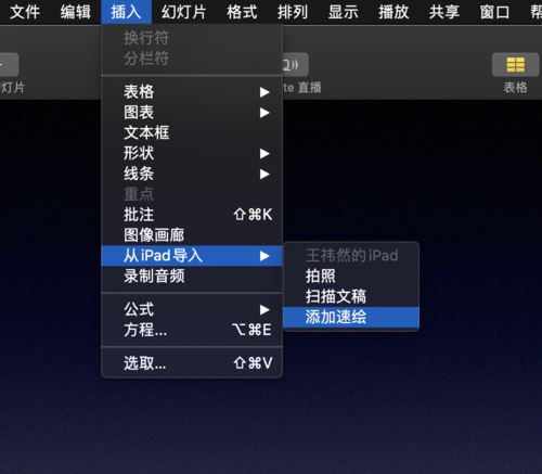 最令我驚奇的一點就是,蘋果還利用iPad作為Mac的數位板來使用。在應用中,可以選擇“插入-從iPad導入-添加速繪”,iPad上就會出現繪畫的界面,然后用手或者Apple Pencil在iPad上繪制的圖案就會添加到當前編輯的圖片或者文字當中。