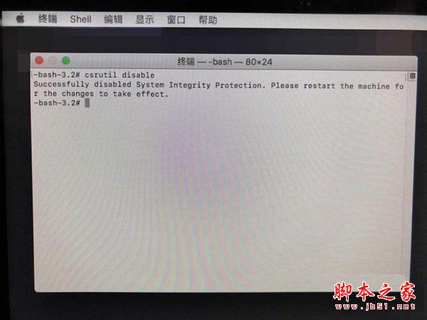 2、進(jìn)入終端以后,在終端我們需要輸入“csrutil disable”這條命令,按下回車,看到下面的提示成功以后我們就解除系統(tǒng)的權(quán)限控制了。