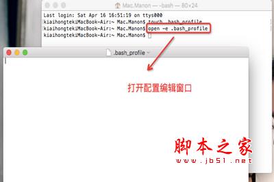 2、如果你是第一次配置環境變量,可以使用“touch .bash_profile” 創建一個。bash_profile的隱藏配置文件(如果你是為編輯已存在的配置文件,則使用“open -e .bash_profile”命令):