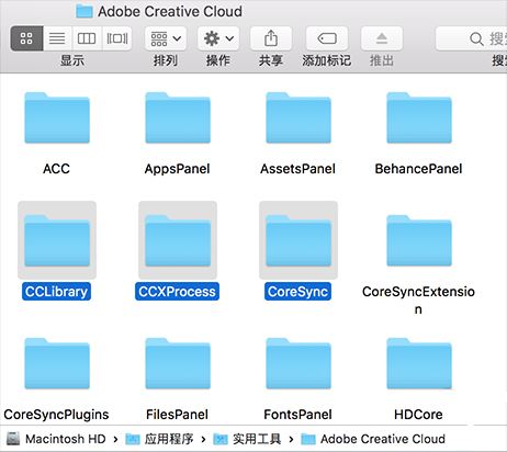 如果不能刪除,在“Finder -應用程序-實用工具-活動監視器”里強制退出CCLibrary.app、CCXProcess.app以及CoreSync.app進程之后再刪除。CCLibrary.app跟Adobe的庫功能有關,CCXProcess.app、CoreSync.app是Adobe Creative Cloud的同步功能進程,常駐后臺浪費系統資源。