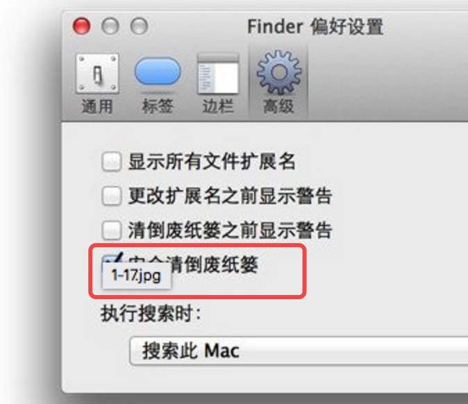 而對于MAC OS X 10.11之后的新版本來說,也許好多人都發現了,蘋果竟然取消了“安全清倒廢紙簍”的功能!那么上面的方法也就沒法用了。在Finder的偏好設置的高級中也沒有了“安全清倒廢紙簍”的選項!
