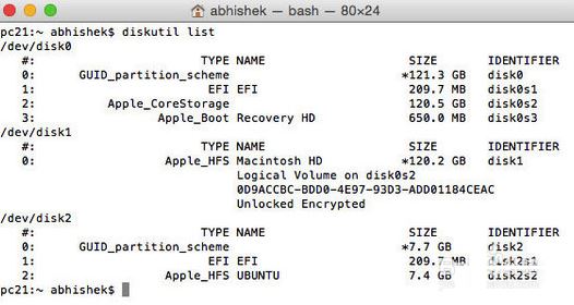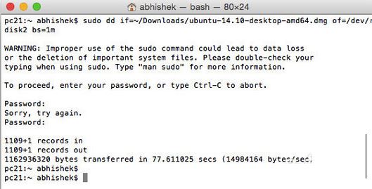 sudo dd if=~/Downloads/ubuntu-14.10-desktop-amd64.dmg of=/dev/rdisk2 bs=1m這里需要使用超級用戶權限(sudo)來運行上面的命令,并輸入密碼。值得注意的是從鍵盤中輸入密碼時看不到任何星號或顯示的提示,是Unix終端的習慣。甚至輸入完密碼后,也不會看到立即的輸出。
