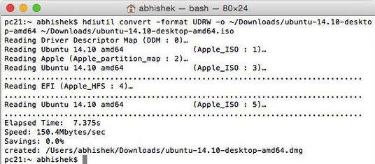 hdiutil convert -format UDRW -o ~/Downloads/ubuntu-14.10-desktop-amd64 ~/Downloads/ubuntu-14.10-desktop-amd64.iso值得注意的是,并沒有新轉換出的文件加上IMG后綴,因為后綴只是個標志,重要的是文件類型并不是文件的擴展名。轉換出來的文件可能會被Mac OS X系統自動加上個.dmg后綴。