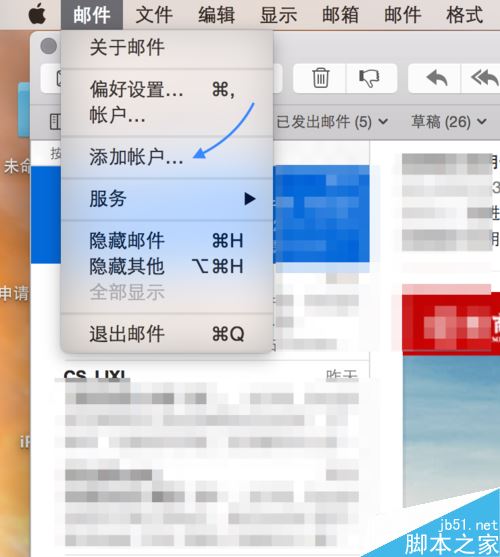 在 Mac 系統中打開郵件應用以后,直接點擊頂部菜單欄中的“郵件”菜單下的“添加帳戶”選項,如圖所示