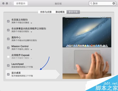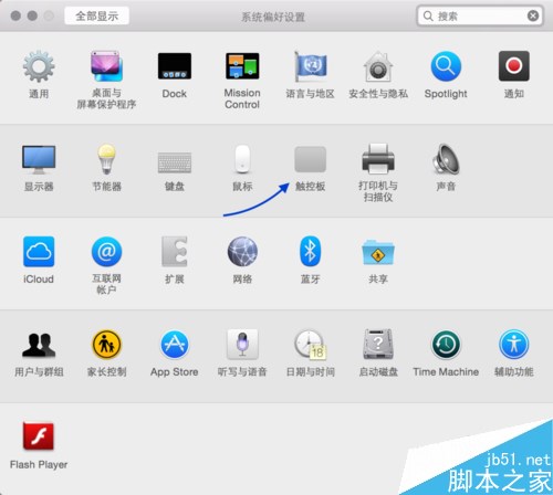 如果你的 Mac 電腦上有觸控板的話,我們還可以用用多指手勢來顯示桌面,非常地方便與快捷。在“系統偏好設置”中點擊打開“觸控板”功能,如圖所示