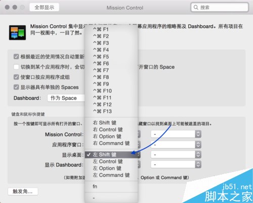 在 Mission Control 界面中,點擊“顯示桌面”下拉列表,可以自己定義一個和 Fn 鍵配合來顯示桌面的按鍵。比如我這里用 Fn+左shift鍵,如圖所示