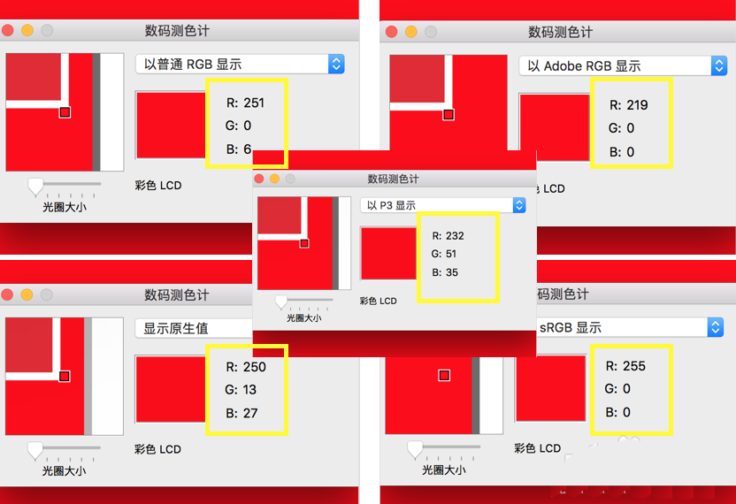 6、用一個純紅色的色塊來測試不同顯示模式的取值差別。下圖可以看到,對于同一個色塊,不同的顯示模式取到的值并不同。