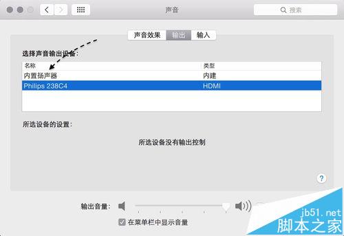 4、隨后請確認(rèn)當(dāng)前聲音輸出設(shè)備是否有多個,比如我這里外接了一個 HDMI 的顯示器,可以輸出聲音。如果在你的 Mac 上也有多個輸出設(shè)備的話,請選擇“內(nèi)置揚聲器”一欄,即 Mac 自帶的喇叭。