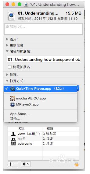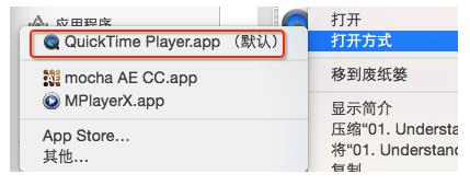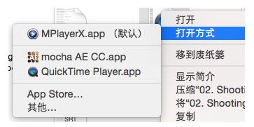 4、這里我拉看到的下拉框里的程序后成括號里有一個(默認)的字樣了,也就也功了,在文件上單擊右鍵 打開方式 里,第一個默認打開的程序當前也更改為 MplayerX.app ,在任意該類型的視頻格式文件上直接雙擊就可以使用該選擇好的程序播放了
