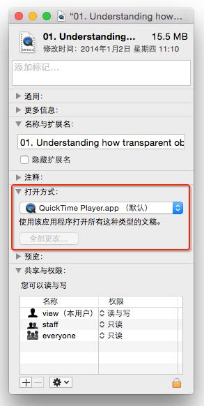 2、使用快捷鍵 command+i 鍵,打開文件簡介(也可以右建 顯示簡介)。這里彈出一個文件簡介的彈框,找到打開方式一欄里面。在右邊的下拉框里可以看到當前默認使用的打開程序單擊下拉框,找到你自己想要的程序,我電腦里裝的是MplayerX.app 所以我這里選擇這個