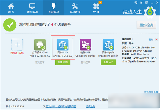 將網卡轉換器插入電腦,電腦會出現不能識別該移動設備的情況,但是別慌。打開驅動人生的外設驅動,找到該網卡轉換器。此時轉換器驅動顯示的是未安裝,點擊安裝,驅動人生在20秒內即能將該無線網卡驅動安裝成功。