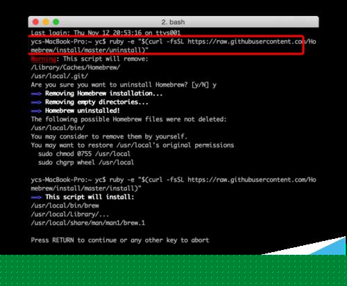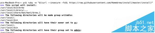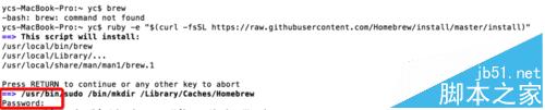 4、輸入密碼后會開始下載homebrew,如果此時網速不穩定可能會出現錯誤提示:curl: (35) Server aborted the SSL handshake。此時需要執行卸載操作,輸入如下命令進行卸載: