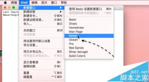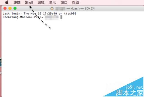 3、在打開了終端以后,接下來請點擊它位于 Mac 屏幕頂部菜單中的 Shell 菜單,如圖所示