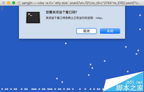6、在觀賞完終端窗口里下雪以后,如果想要退出終端的話,請按直 Command+Q組合按鈕,再點擊【關閉】就可以了。