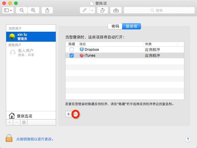 5. 選取你想關閉你的開機程序,例如我想關閉iTunes,我就選取iTunes,點擊紅圈中的減號,操作完成。
