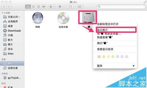 4、選擇這個硬盤,然后兩只手指同時點擊觸摸板,在彈出的小方框中選擇“顯示簡介”即可。