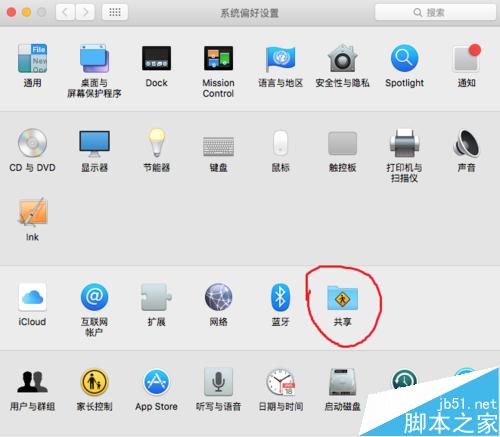 3、接下來是關于如何在Windows上訪問Mac上共享的文件夾。首先在Mac上打開系統(tǒng)偏好設置,在設置中點擊共享。
